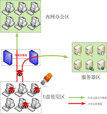 • 当企业使用应用软件控制U盘使用时,并不能彻底防止U盘病毒的传播。使用瑞星防毒墙帮助企业建立U盘安全区,当U盘安全使用区计算机含有病毒访问企业内部资源时,防毒墙进行病毒的过滤