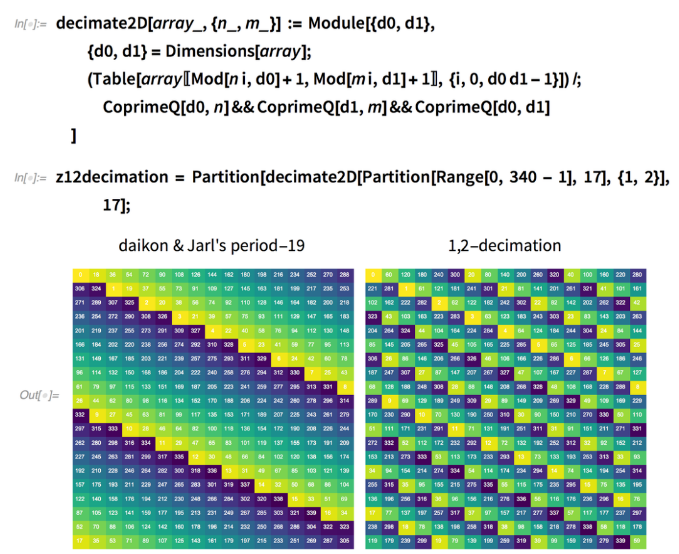 我看到了19周期换位与 20x17 密码的1,2-抽取之间的联系。也就是说,从左上角开始,先移动一个垂直步长,然后再移动两个水平步长,并在水平和垂直方向上定期包裹,就像将密码包裹在圆环上一样。此换位采用与19周期换位类似的对角线: