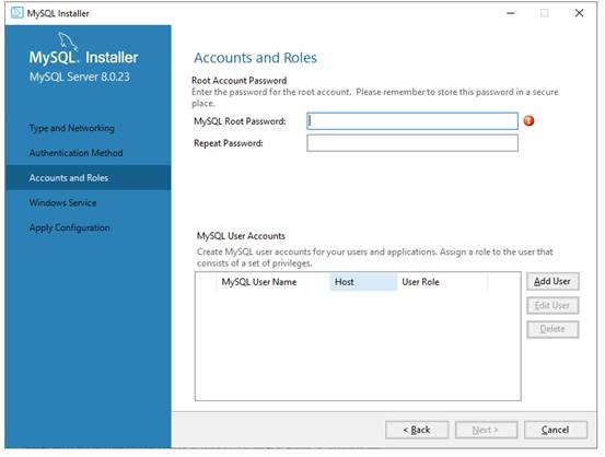 在这里,你需要为你的MySQL根用户提供一个强大的密码。另外,确保你把密码保存在一个安全的地方,以便以后使用。可以选择使用预定义的角色创建额外的MySQL用户账户。完成后立即点击 "下一步"。