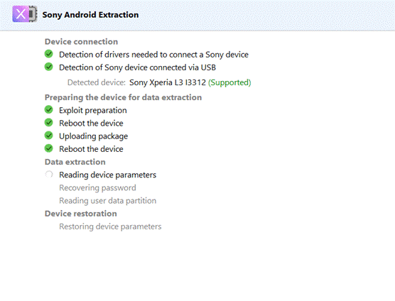 l 下一阶段称为“为数据提取准备设备”。必须遵循“氧气取证提取器”屏幕中显示的说明。完成后,研究人员将看到该设备已准备好进行提取: