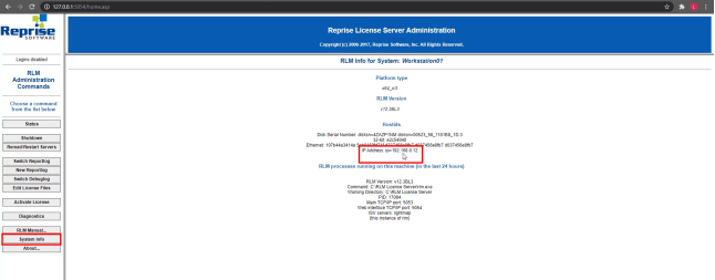 首先,记下 RLM 服务器计算机的 IP 地址。 您可以通过返回 RLM 网页然后单击“系统信息”来找到它,在此示例中它是 192.168.0.12