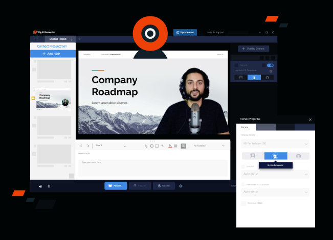 轻松地将网络摄像头添加到演示文稿的顶部,并激活虚拟绿幕以瞬间删除背景!