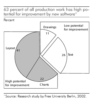 右侧图表显示了图形专家在演示文稿上花费的时间分布。其中 11% 的时间专门用于特定于幻灯片的绘图。另有 26% 的时间用于文本输入。这两部分仅提供有限的改进潜力。打字速度受限于用户的键盘录入技能,而使用智能软件来绘制图像则很难进行标准化。