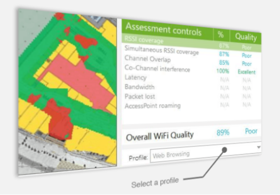 Wi-Fi 质量模块包括两个默认配置文件:网络浏览和 VoIP,参数由我们的无线优化专家预先配置,他们会分析无线网络的适用性,以支持正确的网络浏览和 Wi-Fi 语音通话。 您还可以定义额外的质量控制以适应您的标准。