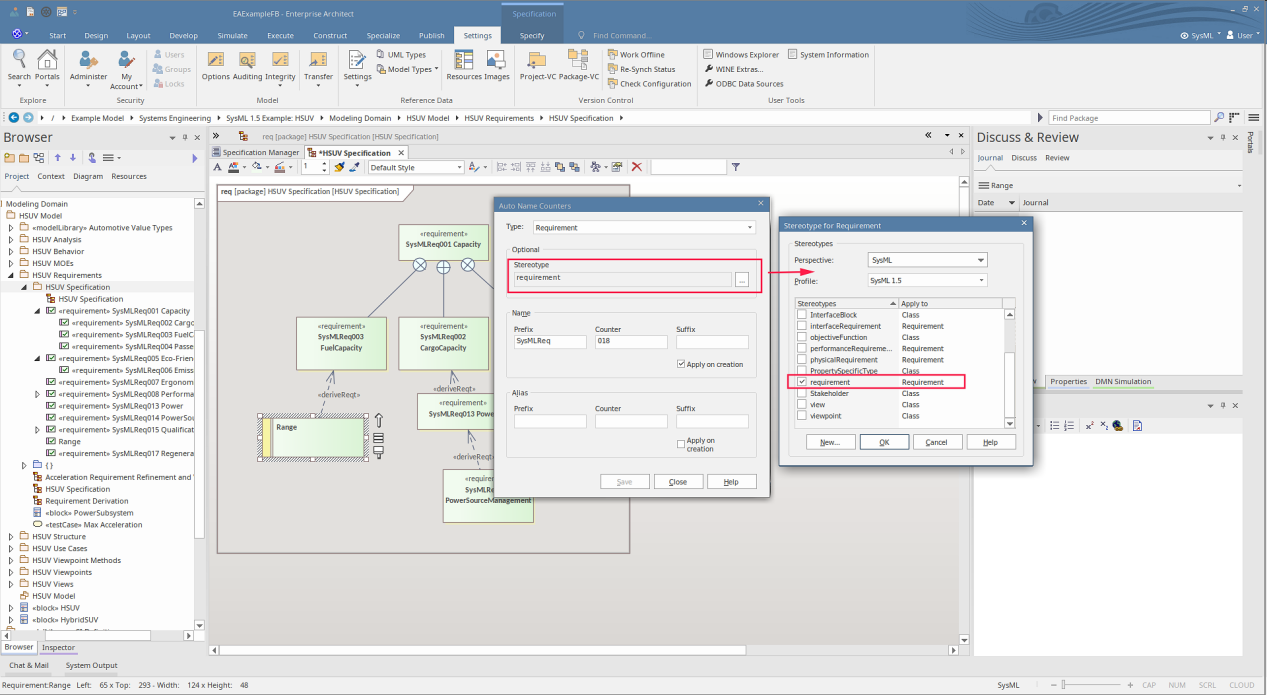 自动命名已扩展为包括针对特定元素类型和构造型。例如,您现在可以通过选择构造型和类型,将标准需求的自动命名单独设置为 SysML 需求。