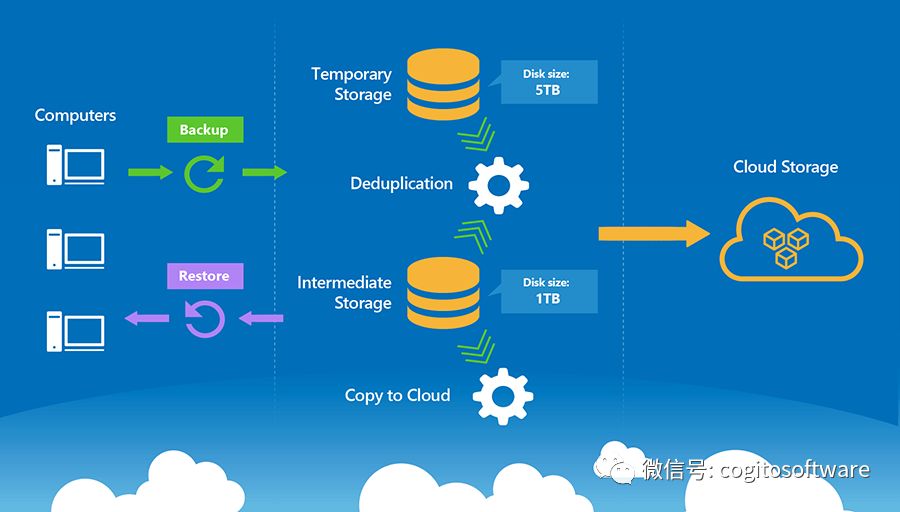 此 Windows 重复数据消除软件与 CloudBerry 备份协同工作, 并处理从客户端工作站和服务器接收的所有数据。完成重复数据消除后, 所有数据将直接移动到用户的云存储帐户。