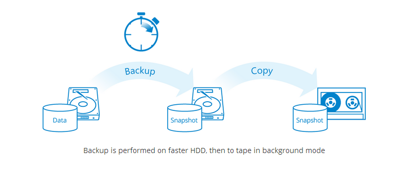 StarWind VTL直接使用采用D2D和D2D2T备份策略的快照。前者是在不再需要实际的磁带硬件时使用的,快照可以直接转到VTL。后一种情况使用VTL作为快速中间体,创建快照的额外副本并将其以背景模式写入物理磁带。因此,StarWind VTL有助于遵守3-2-1备份规则:3个2个格式的数据副本和1个远程站点上的数据副本。