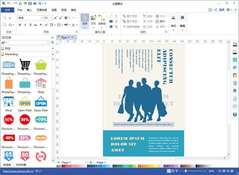 亿图传单设计软件能帮助用户绘制传单、海报、宣传册等。丰富的模板和例子,涵盖大部分图表工具,即使是不熟悉绘画和软件使用的新手,也可以轻松上手;智能的排版布局、一键更换主题,省时且高效;一键导出你的图表作品到各种格式的图片、Html、PDF、SVG、Microsoft Word、PowerPoint、Excel 等。全面的绘制功能,大量的免费模板,满足多方面的绘图需求,亿图软件备受职场人士和教育人士的青睐。