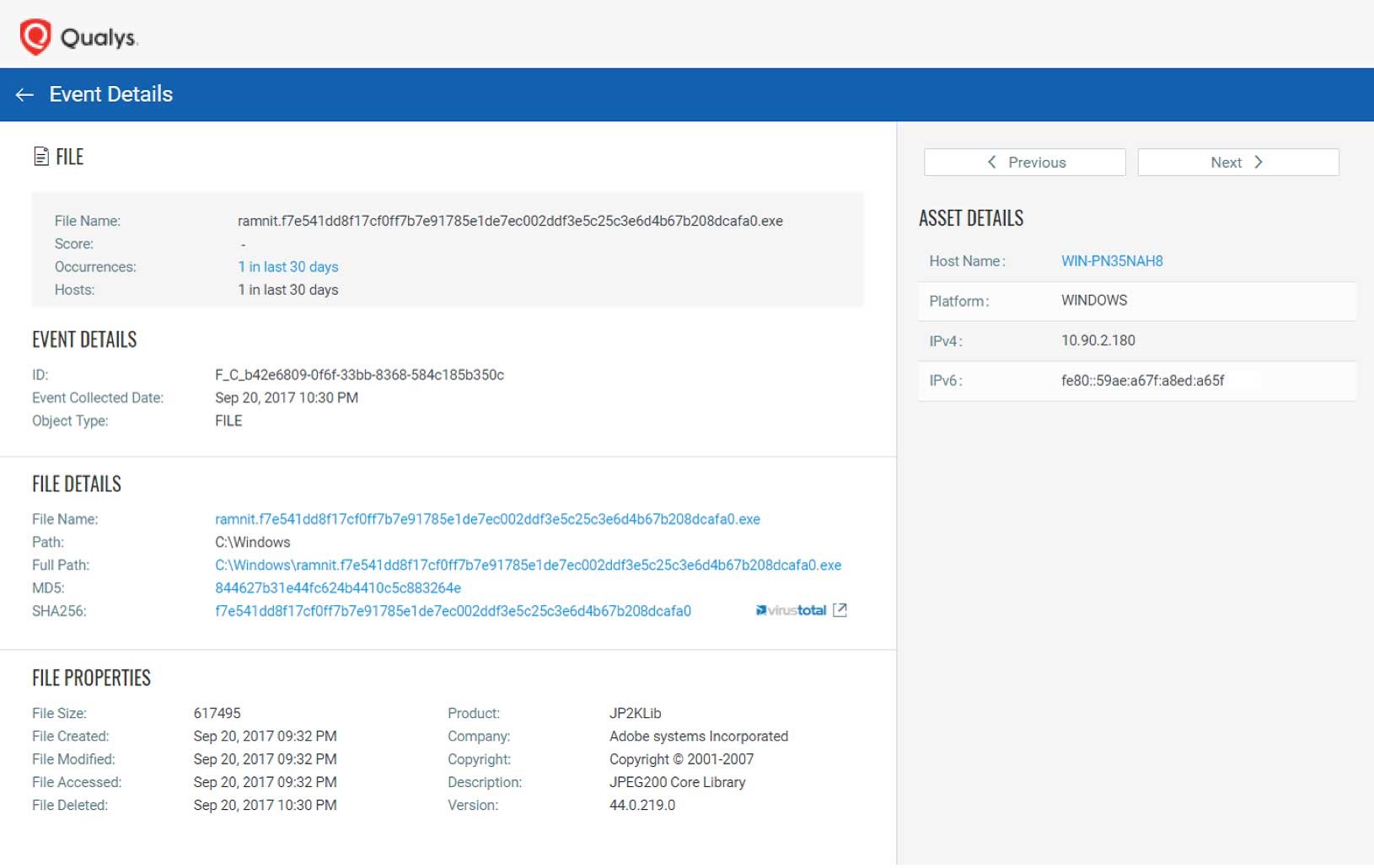 在Qualys云平台上对数十亿个活动和过去的系统事件执行威胁搜索、可疑活动检测和OpenIOC处理,并结合来自Qualys恶意软件实验室的威胁情报数据,以识别恶意软件感染(危害指标)和威胁参与者行为(活动指标)。
