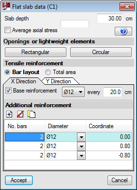 为每个方向提供基础钢筋和附加钢筋的间距和直径(指示附加钢筋相对于柱中心的分离,以作为起点)。对于附加的受拉钢筋,必须引入钢筋,并牢牢固定,不得被任何开口打断。