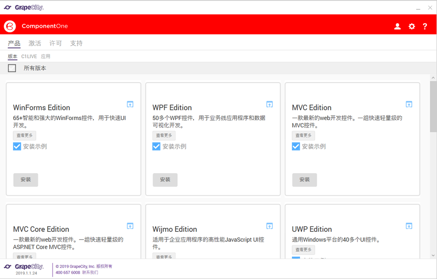 ComponentOne 2019v1 重磅推出了全新的安装管理器,为您提供一站式管理界面,只需打开这个清爽、实用的管理界面,就可以解决 ComponentOne 在您机器上的全部问题,包括: