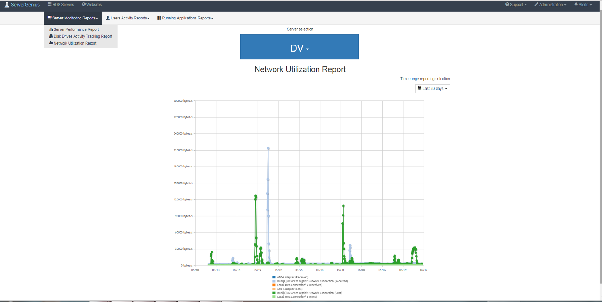 Server Genius可以实时检查CPU,内存,网络性能,存储状态和所有重要参数,从而可以预测远程服务器的任何关键问题。例如,缺陷可能会在许可、宽带消耗或使用某個特定应用程序的情況下出现。