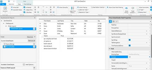 功能区提供了对xamDataGrid最常见功能的访问,并且是配置数据网格的最简单和最快速的方法。如果需要更多的控制,可以使用属性grid自定义Data Grid的几乎每个方面,该属性grid将公开选定xamDataGrid对象可用的每个选项。您提供的所有设置都将在设计图面上实时呈现,以便您验证设计。