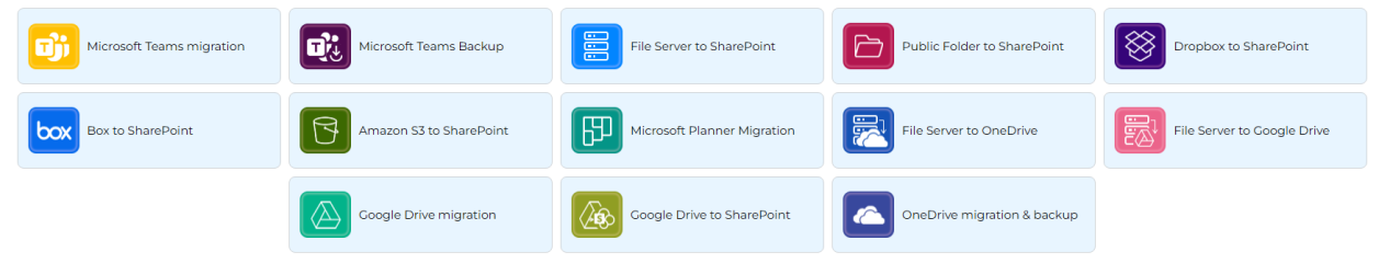 将来自各种来源(包括 SharePoint、Teams、聊天记录、Planner、公共文件夹、文件共享、Google Drive、Dropbox、Box、Amazon S3 存储桶和 OneDrive)的数据迁移到 Microsoft 365。它是将多平台数据迁移到 Office 365 的最佳一体化解决方案。