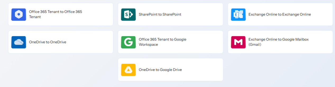 Kernel Cloud Tenant Migration 工具涵盖您企业所需的所有迁移路径。探索 Office 365 和 Google Workspace 的各种迁移方案,开启您的云到云迁移之旅。