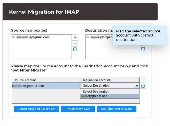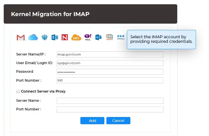 使用所需的凭据选择并添加源 IMAP 帐户和目标 IMAP 帐户。