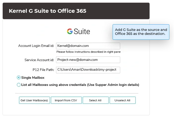 将多个大型 Google 邮箱迁移到 Exchange Online。只需使用包含必要凭据的 CSV 文件快速添加和映射邮箱,然后将该 CSV 文件导入软件,即可轻松执行从 G Suite 到 Office 365 的批量迁移。G Suite 迁移工具会自动读取和处理该文件。