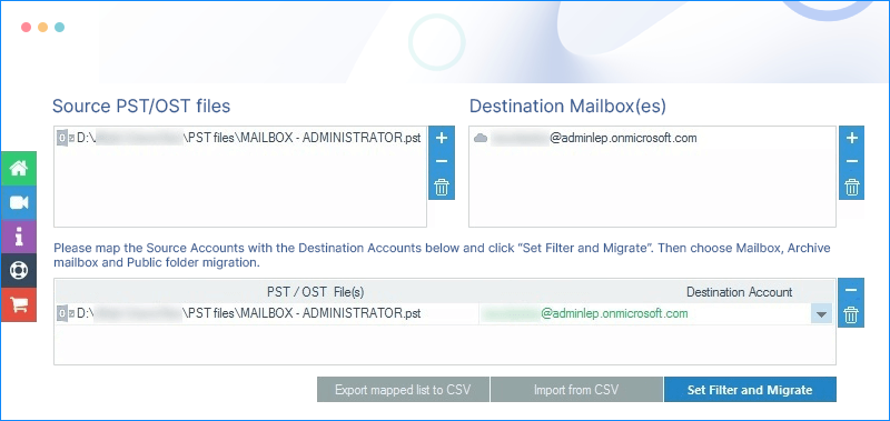 步骤 4:选择单个/存档邮箱,并将源邮箱映射到目标邮箱。选择“设置筛选器”并“迁移”。