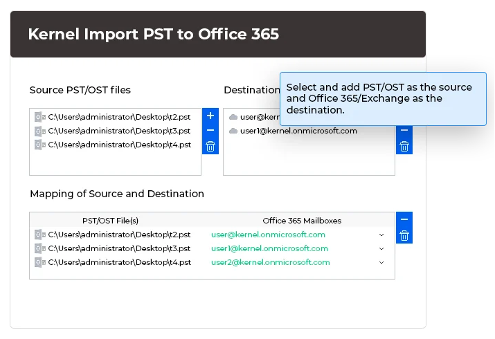 使用 PST 到 Office 365 迁移工具执行批量邮箱迁移,不会造成任何中断。一次性选择并添加多个 Outlook PST 文件,然后将其一次性直接上传到 Office 365 租户。