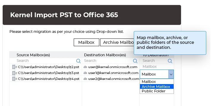 使用Import PST files to Office 365工具,您可以将单个或多个 PST 文件迁移到 Exchange 服务器。该工具与所有 Exchange 服务器版本高度兼容,包括 2010、2013、2016 等,并支持将 PST 文件顺利导入到本地、托管或在线 Exchange 服务器。