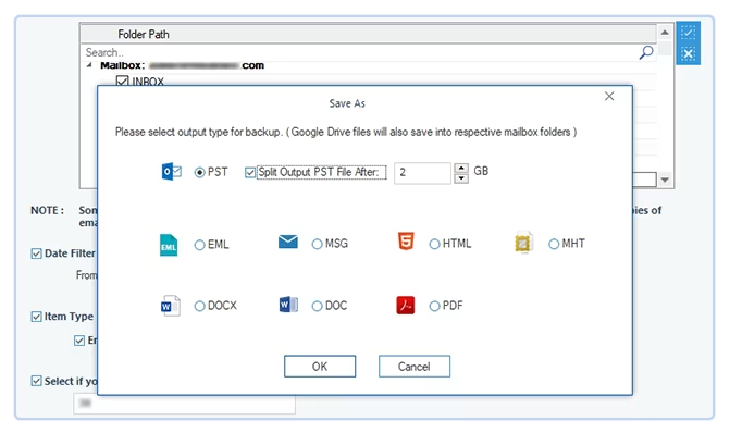步骤 6:从可用格式中选择输出类型——PST、MSG、EML、PDF、DOC、DOCX、HTML 和 MHT。单击“确定”。
