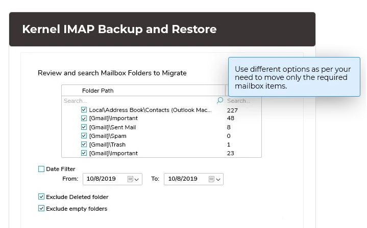 可以使用多种筛选选项(例如文件夹选择、日期范围、排除文件夹等)对邮箱数据执行选择性 IMAP 备份。这些筛选器可以轻松地确定优先级,并仅备份所需的 IMAP 电子邮件。