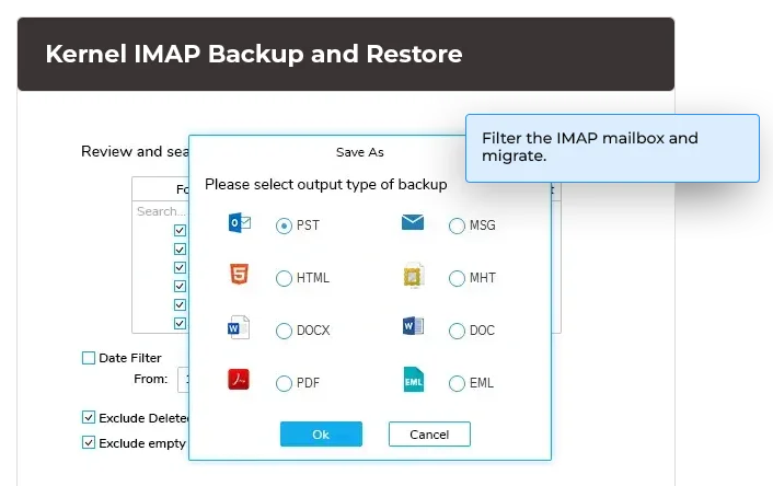 Kernel IMAP Backup and Restore 允许您通过三个简单的步骤执行安全的 IMAP 邮箱备份过程: